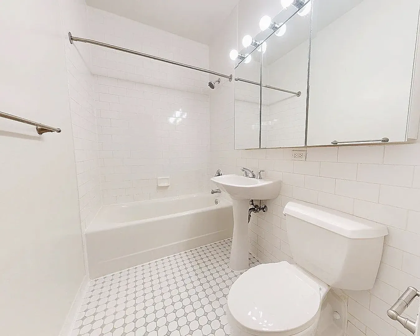 Modern Bathrooms with decorative tile, hexagonal floors, and illuminated vanity mirrors