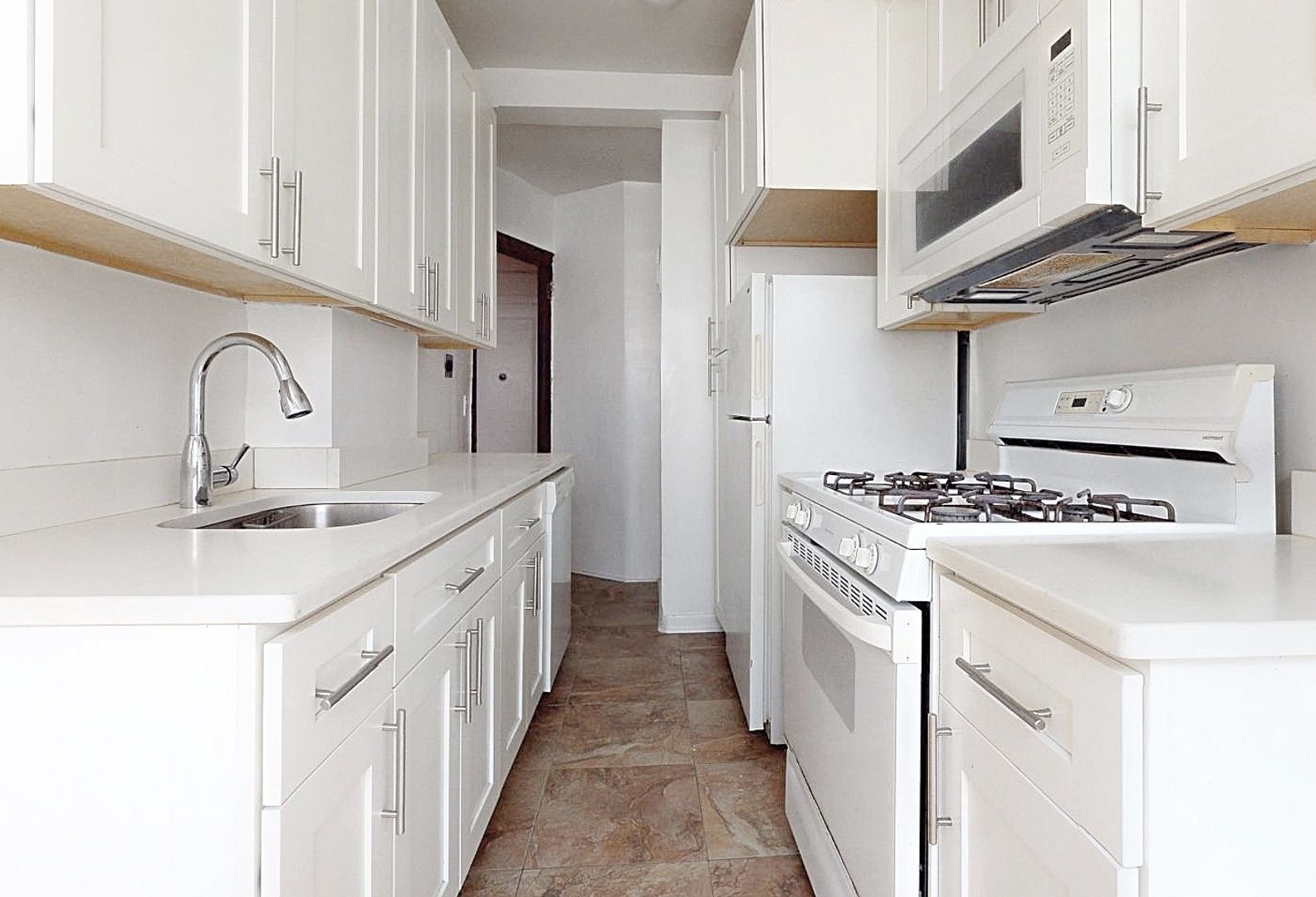 — a luxurious and spacious 2-bedroom, 2-bath residence that perfectly blends timeless pre-war elegance with modern comfort. Step into an expansive sun-drenched living room that offers endless design possibilities, complemented by soaring ceilings, stunning herringbone floors, custom moldings, and rich architectural details. Both king-sized bedrooms feature oversized closets and large windows that fill the space with natural light, while the two pristine full bathrooms showcase classic fixtures and generous storage. The fully equipped galley kitchen is designed for both style and function, offering sleek countertops, abundant cabinet space, a dishwasher, and a microwave.