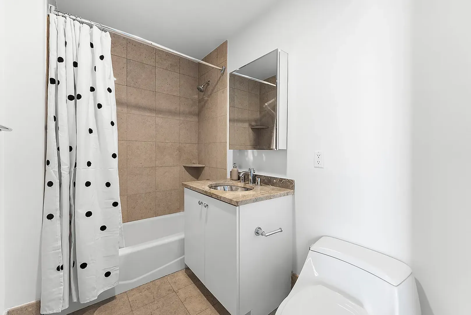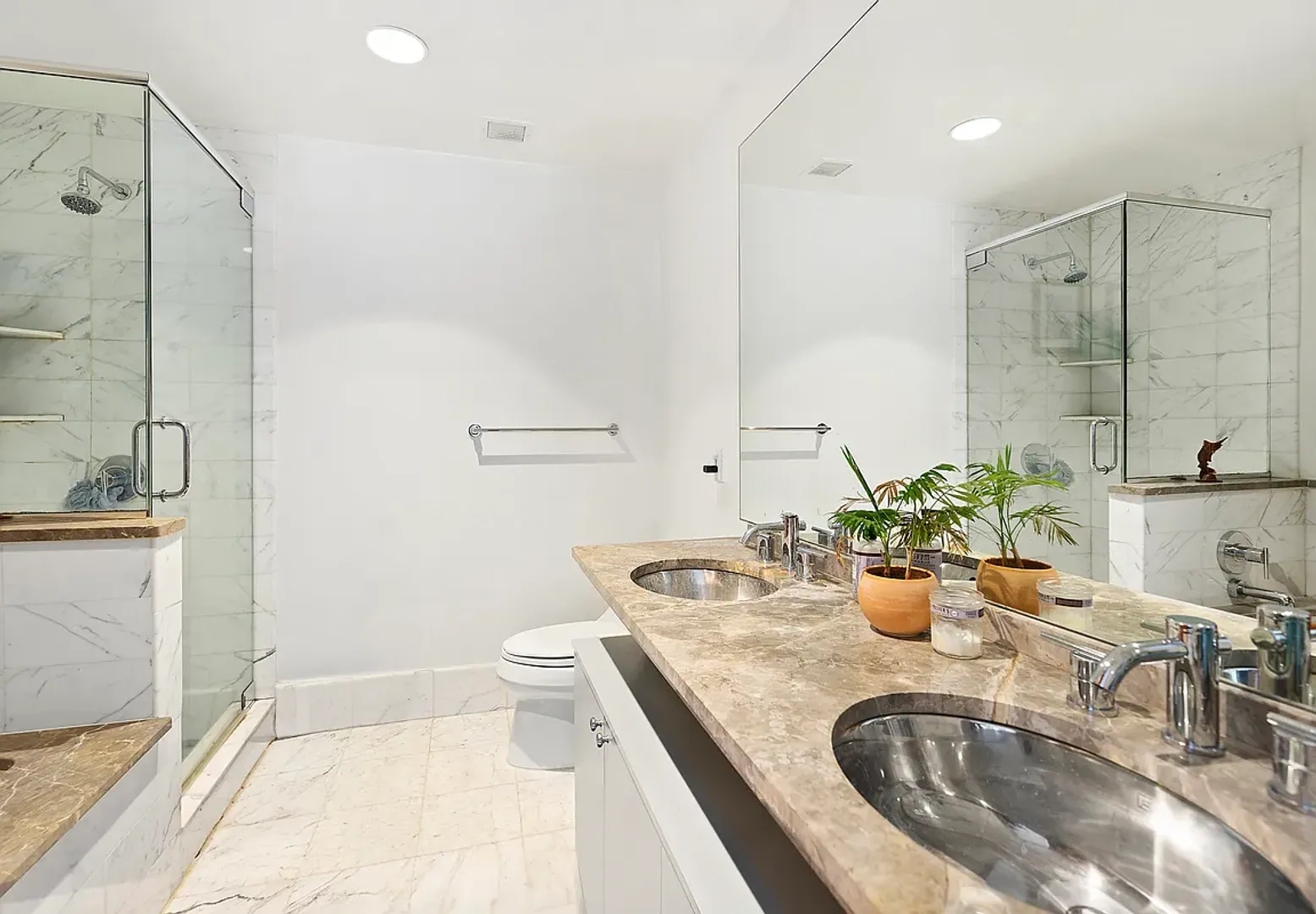 The bright open concept living room fits a sectional couch, accent chairs and a dining table. The spacious primary bedroom fits a king size bed and features a large walk-in closet as well as a marble primary bathroom with a double vanity, deep soaking tub, separate glass-enclosed shower, and updated lighting fixtures.The second bedroom can fit a queen-size bed or bunk bed and a desk.